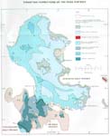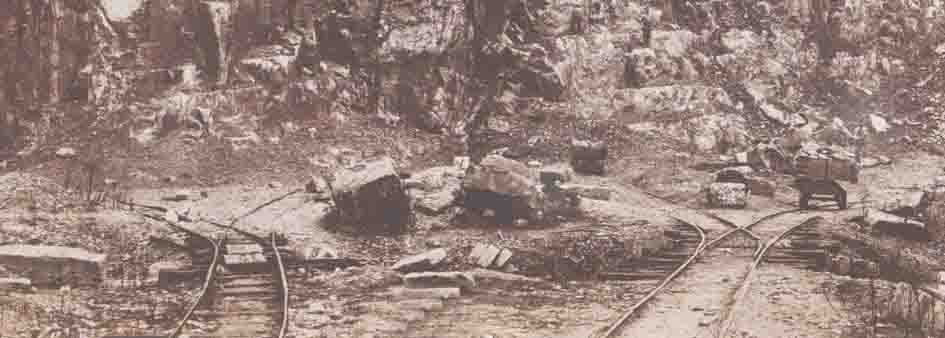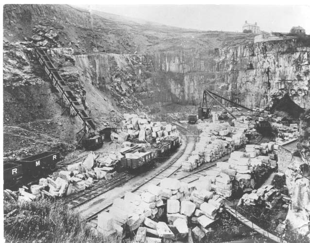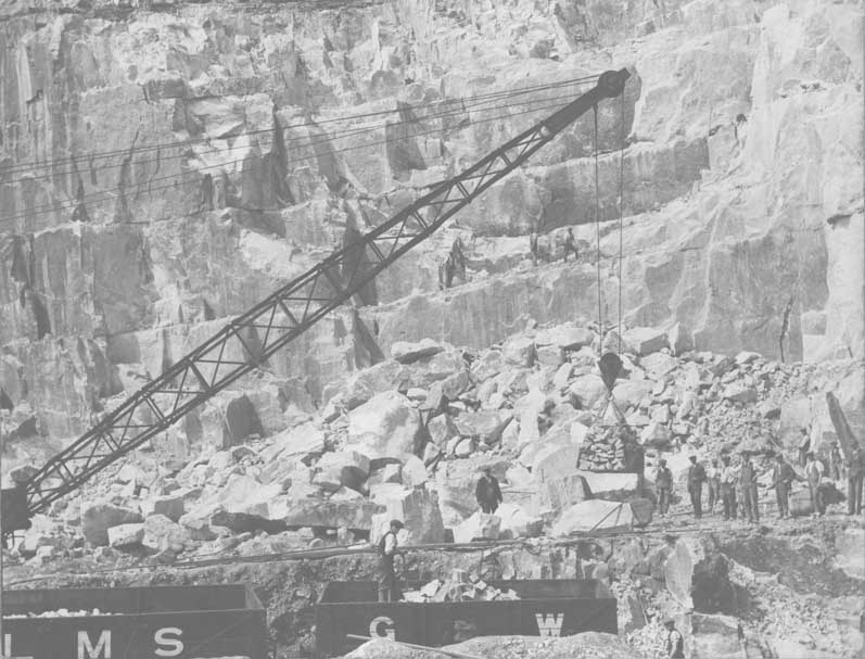A view of the interior of the quarry in the 1920's.  The rail link is clearly shown.  The derrick crane in the quarry bottom has been erected to exploit the 'sink hole' area of the quarry.  Block stone ready for working is piled in the foreground.  Chutes for loading rail wagons with roadstone are arranged on  the bluff to the left.