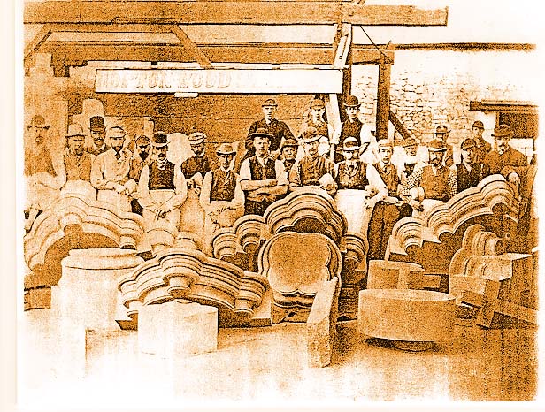 Early photograph of banker masons with their work at Hopton No. 1 Quarry.  The building in the background still exists.