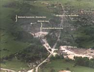 A recent aerial view of Middleton-by-Wirksworth.  Geological features are marked.  This is the same quarry as depicted in the 1898 flyer.  It was smaller then, and 43 houses in the village remained undisturbed!
