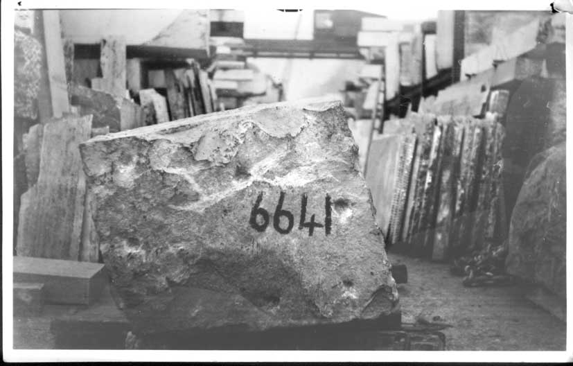 When this block was felled from the Hopton-Wood Stone quarry face it was calculated to have weighed 282 tons. The quarryman is drilling a series of holes along the line he intends to break it at by inserting sets of plugs and feathers.  After they have been fitted he will strike them gradually home along the line to set up a tension in the block that will split it evenly to a manageable size that can be easily sawn.