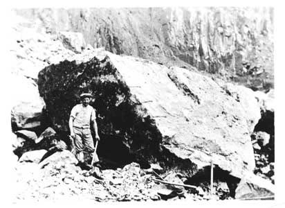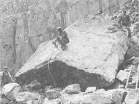 This workman in the Hopton-Wood Stone quarry at Middleton has been set the task of reducing this block to manageable proportion.  Blocks up to 14 feet long have been known to be extracted!